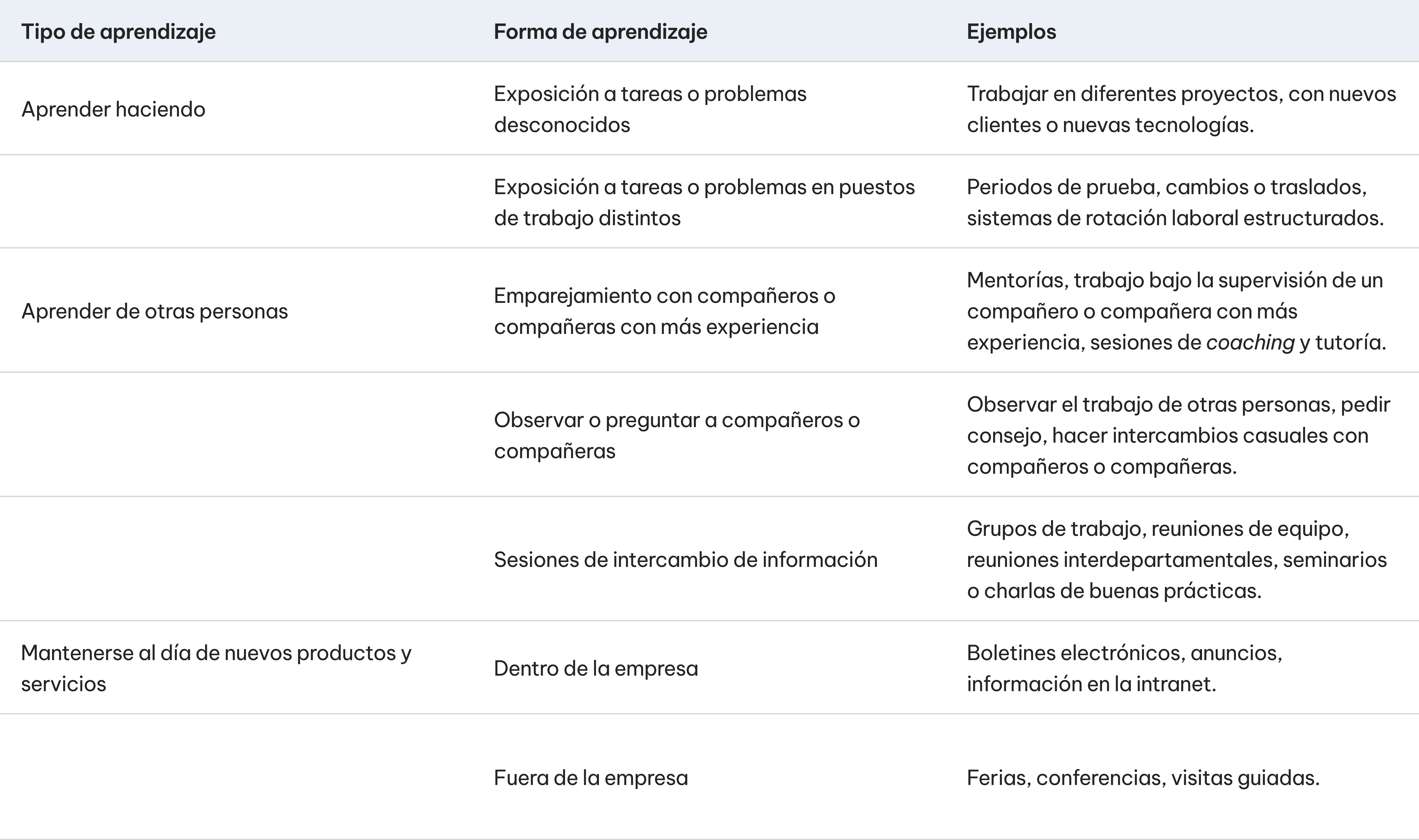 Las personas trabajadoras aprenden haciendo cuando se enfrentan a nuevas situaciones y problemas, tanto en su puesto de trabajo como en otros puestos (por ejemplo, mediante rotaciones laborales). También pueden aprender de personas con más experiencia, observando o preguntando a sus compañeros o compañeras, o participando en sesiones de intercambio o compartición de información. Finalmente, pueden mantenerse al día de nuevos productos y servicios tanto dentro como fuera de la empresa, lo que les permite actualizar sus conocimientos de forma constante.
