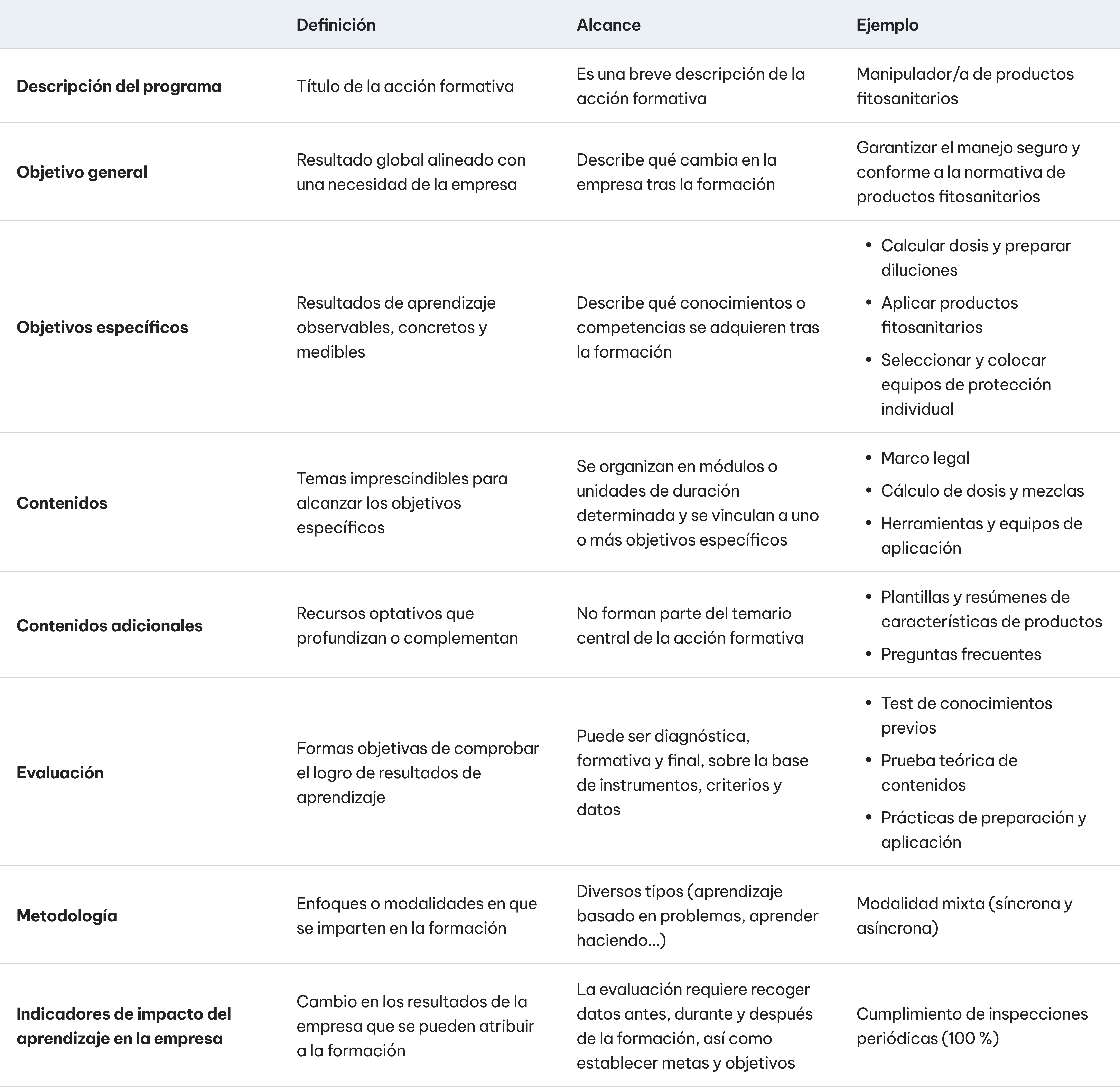 La siguiente tabla recoge los distintos elementos que debe incorporar un programa o acción formativa, con su definición y su alcance: