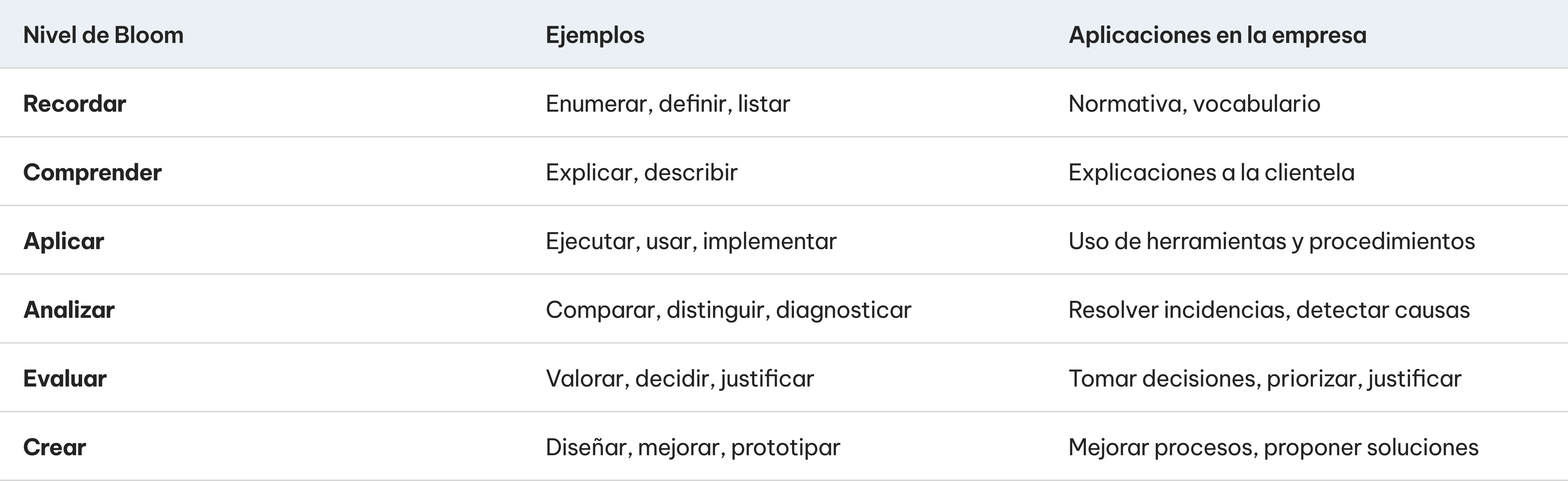 En particular, se puede utilizar la taxonomía de Bloom para diseñar y evaluar objetivos de aprendizaje en línea con los marcos de competencias.
